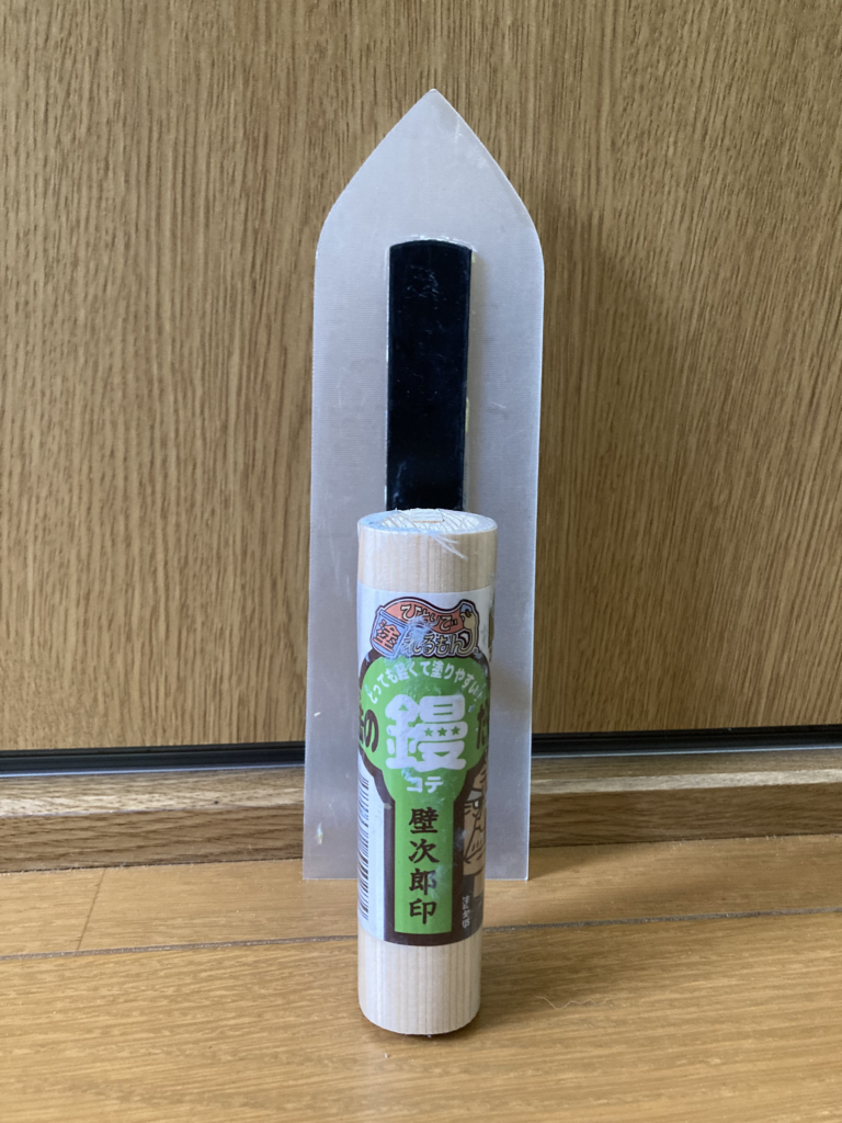 私は友安製作所HPでも紹介されている『魔法の鏝(こて)だもん』を使用しましたが、板がやわらかくて塗りやすかったです。四角いタイプもありますが、先が舟形になっているタイプ(写真)のほうが壁の隅が塗りやすいと思います。