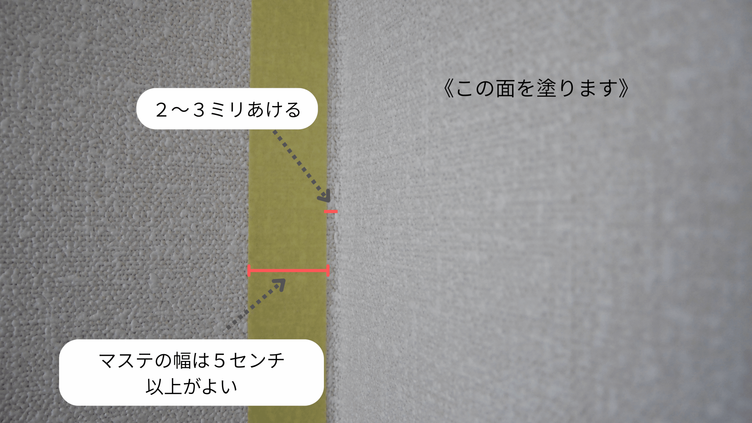 • 塗料は2〜3ミリ程の厚さに塗ります。なので、塗りたい面から2〜3ミリあけてマスキングテープを貼っていきます。