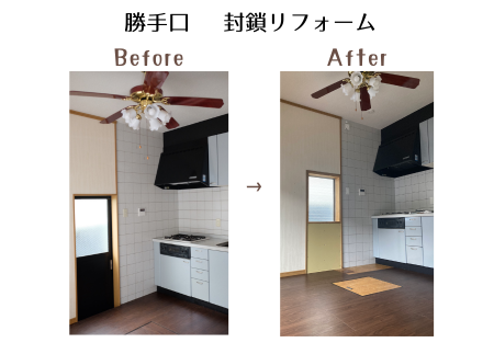 こちらもリフォーム会社さんにお願いして、扉を完全に封鎖。明かり取りの窓は残したまま、壁と面一(つらいち)にしていただきました。(さすがプロ!美しい仕上がりです。)