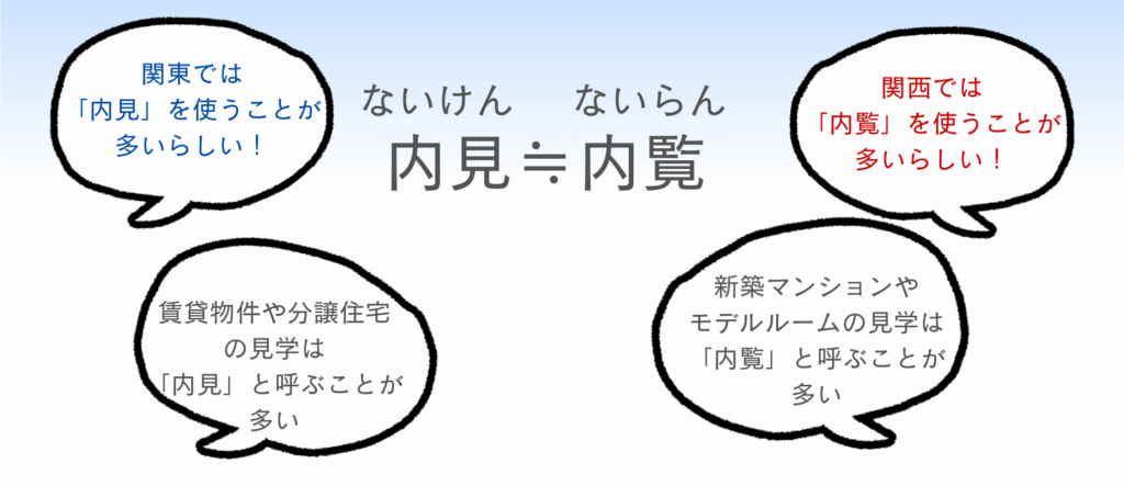 ちなみに、「内覧」と似た言葉で「内見」というものもあります。物件の種類や地域によって使い分けられることもあるようですが、基本的には同じ意味だそうです!